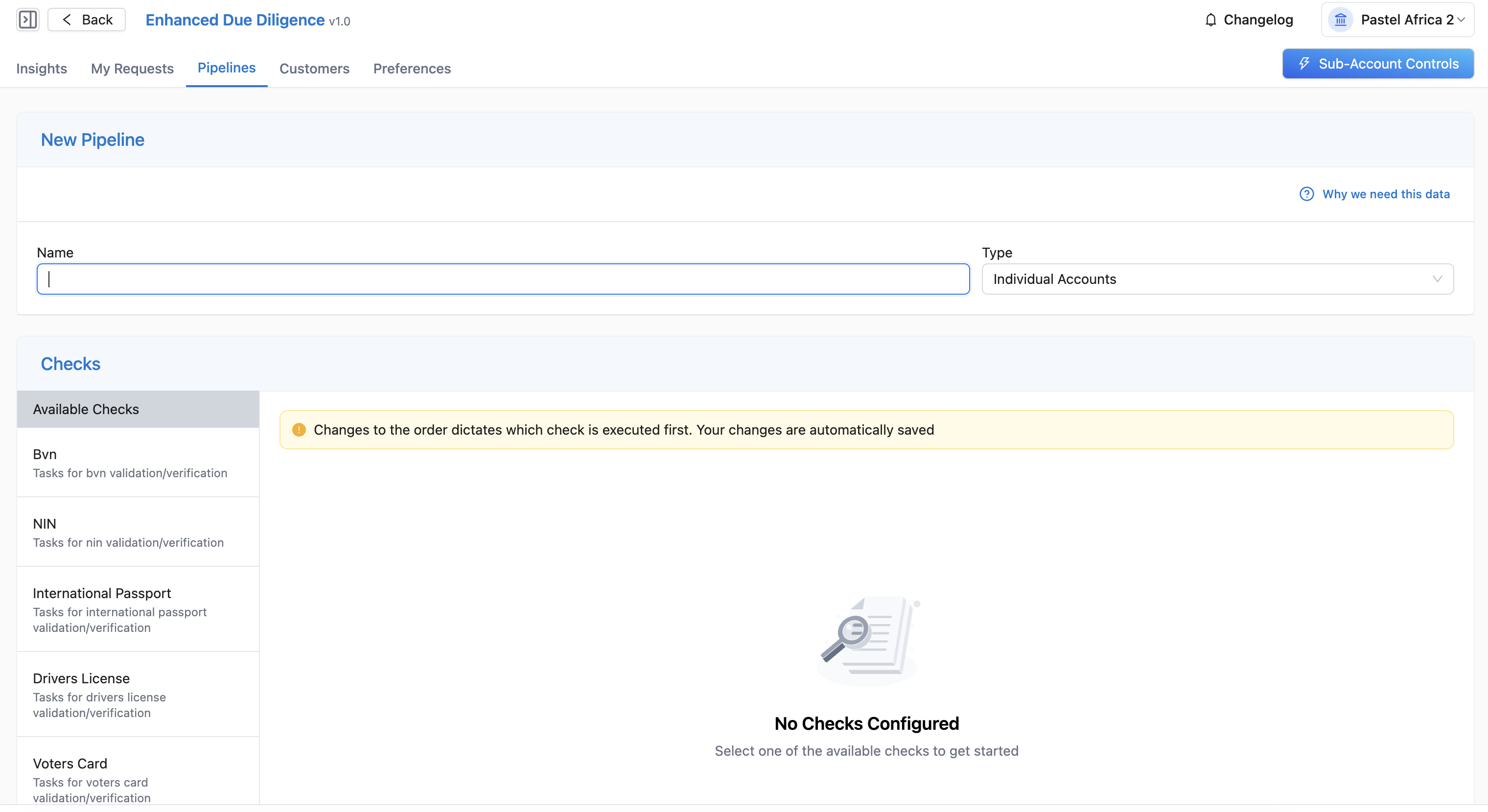 An EDD pipeline is a configurable workflow that defines the verification checks, risk rules, and approval processes for Enhanced Due Diligence requests. Pipelines automate the verification process by specifying which checks to perform, what data to compare, and how to handle different risk levels.Pipelines can only be created through the Sigma